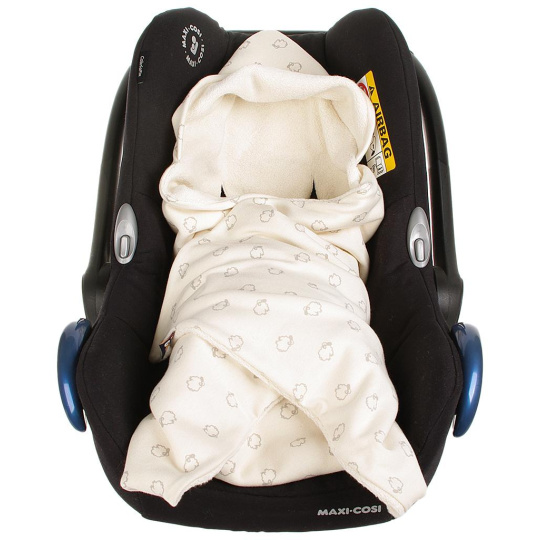 Letní zavinovačka do dětské autosedačky s tříbodovým zapínáním. Zavinovačka je s motivem beránků, je vyrobená ze 100% bio-bavlny, na dotyk je měkoučká a heboučká. Rozměr cca 75 x 75 cm, praní na 40 °C. Použití - vložit zavinovačku do autosedačky, otvory protáhnout bezpečnostní pásy, připoutat miminko, podle teploty zavinovačku zavinout a zapnout na suchý zip, nebo nechat otevřenou. Česká výroba.