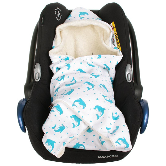 Letní zavinovačka do dětské autosedačky s tříbodovým zapínáním. Zavinovačka je s motivem aqua delfínků, je vyrobená ze 100% bio-bavlny, na dotyk je měkoučká a heboučká. Rozměr cca 75 x 75 cm, praní na 40 °C. Použití - vložit zavinovačku do autosedačky, otvory protáhnout bezpečnostní pásy, připoutat miminko, podle teploty zavinovačku zavinout a zapnout na suchý zip, nebo nechat otevřenou. Česká výroba.