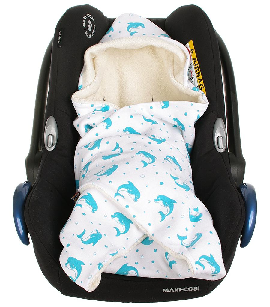 Letní zavinovačka do dětské autosedačky s tříbodovým zapínáním. Zavinovačka je s motivem aqua delfínků, je vyrobená ze 100% bio-bavlny, na dotyk je měkoučká a heboučká. Rozměr cca 75 x 75 cm, praní na 40 °C. Použití - vložit zavinovačku do autosedačky, otvory protáhnout bezpečnostní pásy, připoutat miminko, podle teploty zavinovačku zavinout a zapnout na suchý zip, nebo nechat otevřenou. Česká výroba.