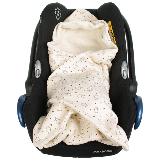Letní zavinovačka do dětské autosedačky s tříbodovým zapínáním. Zavinovačka je s motivem králíků, je vyrobená ze 100% bio-bavlny, na dotyk je měkoučká a heboučká. Rozměr cca 75 x 75 cm, praní na 40 °C. Použití - vložit zavinovačku do autosedačky, otvory protáhnout bezpečnostní pásy, připoutat miminko, podle teploty zavinovačku zavinout a zapnout na suchý zip, nebo nechat otevřenou. Česká výroba.