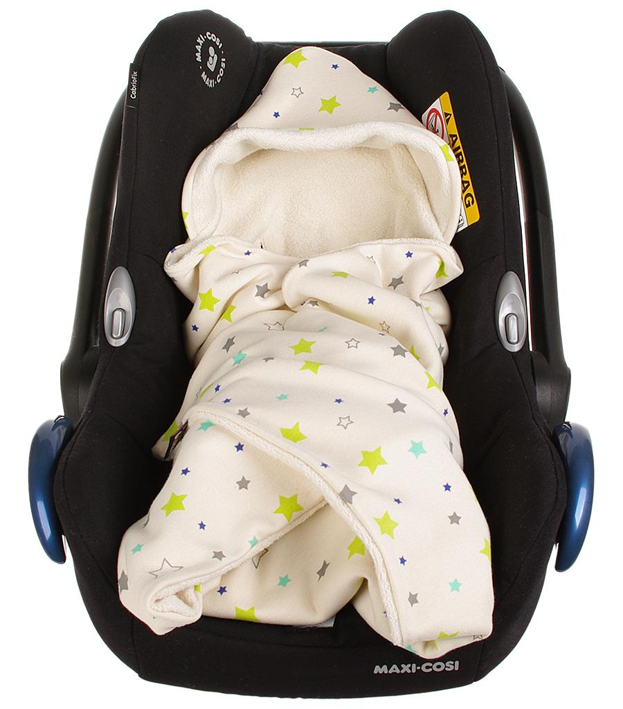 Letní zavinovačka do dětské autosedačky s tříbodovým zapínáním. Zavinovačka je s motivem hvězdiček, je vyrobená ze 100% bio-bavlny, na dotyk je měkoučká a heboučká. Rozměr cca 75 x 75 cm, praní na 40 °C. Použití - vložit zavinovačku do autosedačky, otvory protáhnout bezpečnostní pásy, připoutat miminko, podle teploty zavinovačku zavinout a zapnout na suchý zip, nebo nechat otevřenou. Česká výroba.