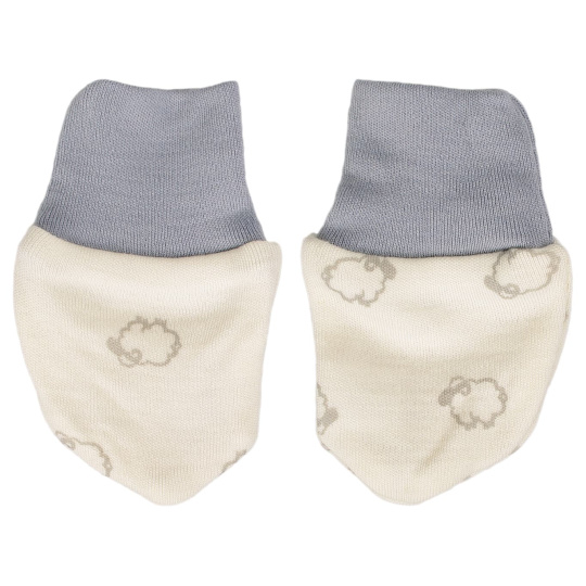 Bezpalcové rukavičky pro novorozené miminko. Rukavičky jsou vyrobené ze 100% merino vlny - úpletu s motivem beránků. Merino vlna je hebká na dotek a nekouše jako klasická vlna, má výborné termoregulační vlastnosti a hřeje i když je mokrá. Rukavice ochrání miminko před poškrábáním obličeje a udržují ručičky v teple. Lze prát v pračce na 30 °C na vlněný program v přípravcích na vlnu. Při praní nepoužívat aviváž, ta vlnu zničí. Nesušit v sušičce. Česká výroba.