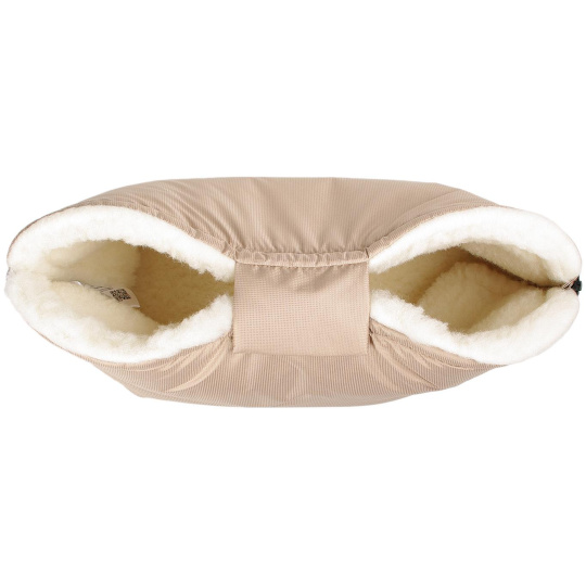 Béžový merino rukávník na kočárek s nepromokavou vnější vrstvou. Na sluníčku jde barva až do zlaté. Podšívka je z merino vlny a výplň z oteplovacího rouna. Rukávník je nepromokavý, je větruvzdorný a pasuje na všechny klasické rukojeti kočárků, které jsou v celku. Ruční praní, nepoužívat aviváž. Česká výroba.