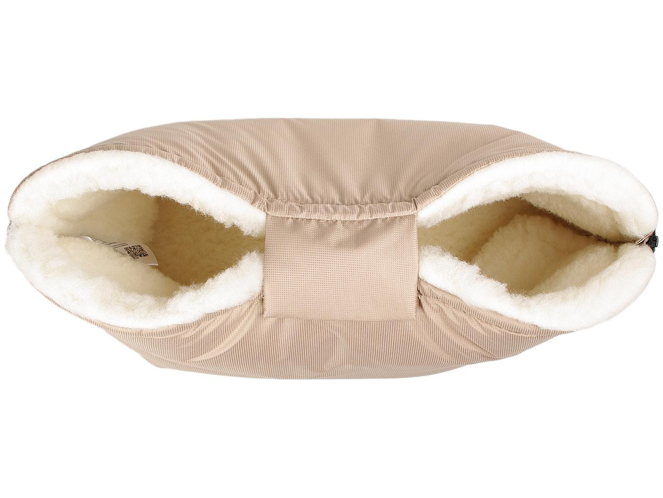 Béžový merino rukávník na kočárek s nepromokavou vnější vrstvou. Na sluníčku jde barva až do zlaté. Podšívka je z merino vlny a výplň z oteplovacího rouna. Rukávník je nepromokavý, je větruvzdorný a pasuje na všechny klasické rukojeti kočárků, které jsou v celku. Ruční praní, nepoužívat aviváž. Česká výroba.