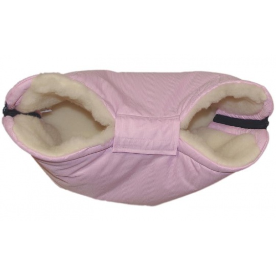 Světle růžový rukávník na kočárek s nepromokavou vnější vrstvou. Podšívka je z merino vlny a výplň z oteplovacího rouna. Ruční praní, nepoužívat aviváž. Česká výroba.
