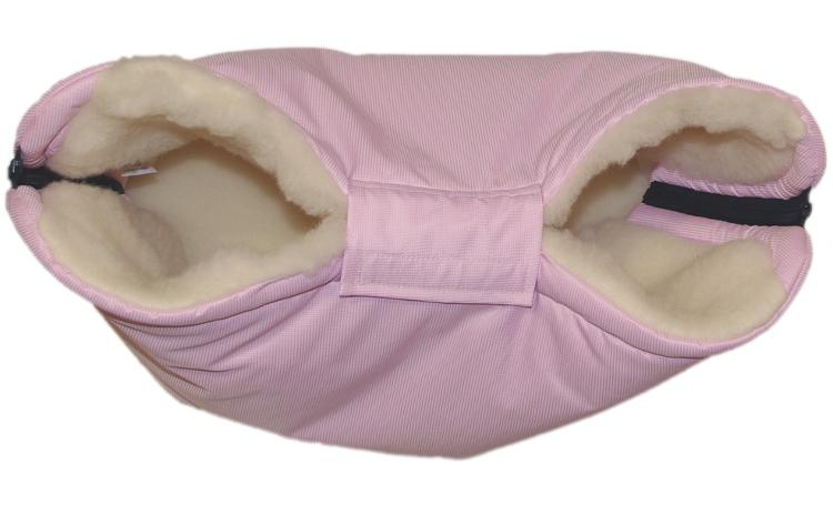 Světle růžový rukávník na kočárek s nepromokavou vnější vrstvou. Podšívka je z merino vlny a výplň z oteplovacího rouna. Ruční praní, nepoužívat aviváž. Česká výroba.