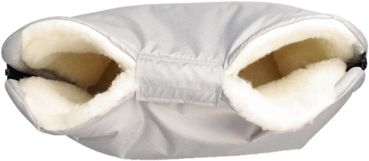 Světle šedý rukávník na kočárek s nepromokavou vnější vrstvou. Podšívka je z merino vlny a výplň z oteplovacího rouna. Ruční praní, nepoužívat aviváž. Česká výroba.