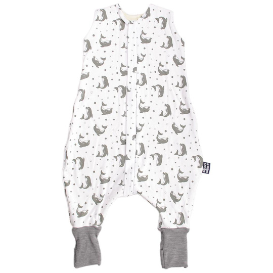 Nožičkový spací pytel s podšívkou z úpletu z merino vlny. Vnější strana je ze 100% bio-bavlny s motivem šedých delfínků. Délka spacího pytle je 70 cm - to je délka miminka od ramen ke kotníkům. Zip umožní otevření spacího pytle po celé délce v obou směrech a má látkovou krytku, která zabraňuje přiskřípnutí krku do zipu. Lze prát v pračce na max 30°C program na vlnu.. Nepoužívat aviváž! Česká výroba.