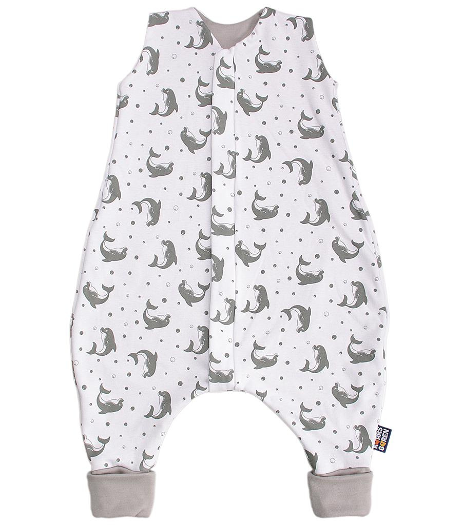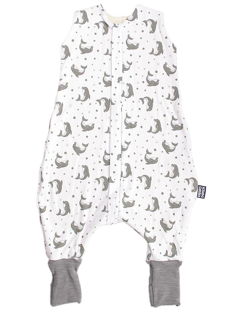 Nožičkový spací pytel s podšívkou z úpletu z merino vlny. Vnější strana je ze 100% bio-bavlny s motivem šedých delfínků. Délka spacího pytle je 70 cm - to je délka miminka od ramen ke kotníkům. Zip umožní otevření spacího pytle po celé délce v obou směrech a má látkovou krytku, která zabraňuje přiskřípnutí krku do zipu. Lze prát v pračce na max 30°C program na vlnu.. Nepoužívat aviváž! Česká výroba.