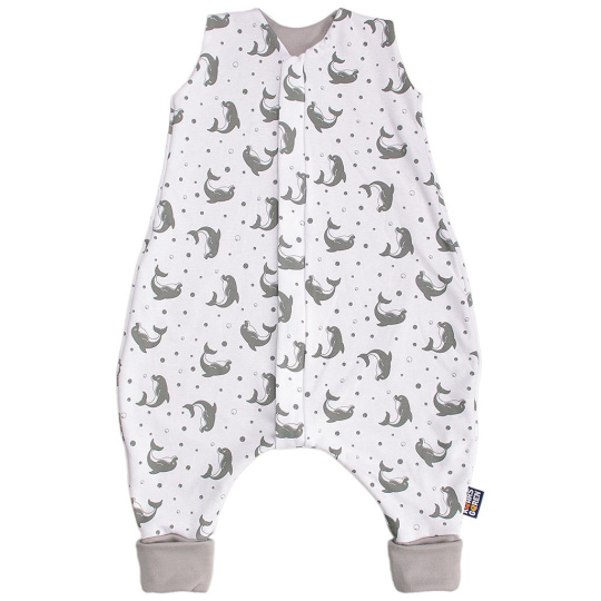 Nožičkový spací pytel s podšívkou z úpletu z merino vlny. Vnější strana je ze 100% bio-bavlny s motivem šedých delfínků. Délka spacího pytle je 80 cm - to je délka miminka od ramen ke kotníkům. Zip umožní otevření spacího pytle po celé délce v obou směrech a má látkovou krytku, která zabraňuje přiskřípnutí krku do zipu. Lze prát v pračce na max 30°C program na vlnu.. Nepoužívat aviváž! Česká výroba.