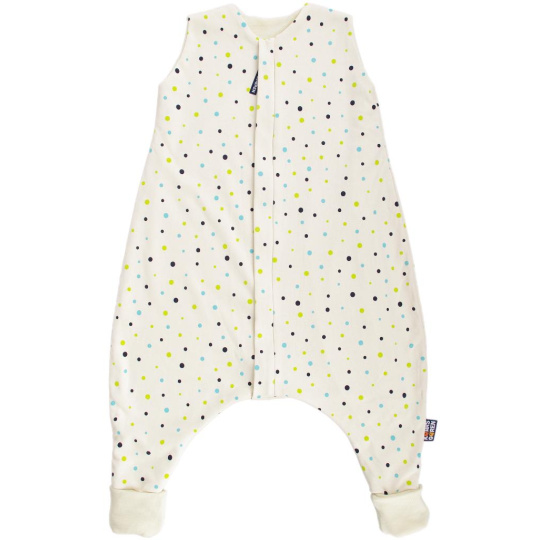 Nožičkový spací pytel s podšívkou z úpletu z merino vlny. Vnější strana je ze 100% bio-bavlny s motivem puntíků. Délka spacího pytle je 90 cm - to je délka dítěte od ramen ke kotníkům. Zip umožní otevření spacího pytle po celé délce v obou směrech a má látkovou krytku, která zabraňuje přiskřípnutí krku do zipu. Lze prát v pračce na max 30°C program na vlnu.. Nepoužívat aviváž! Česká výroba.
