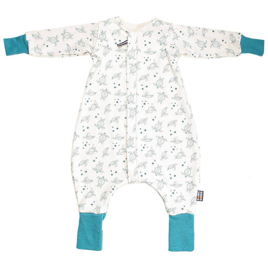 Nožičkový spací pytel s odepínacími rukávy, podšívka je z úpletu z merino vlny. Vnější strana je ze 100% bio-bavlny s motivem želviček. Délka spacího pytle je 70 cm - to je délka miminka od ramen ke kotníkům. Zip umožní otevření spacího pytle po celé délce v obou směrech a má látkovou krytku, která zabraňuje přiskřípnutí krku do zipu. Rukávy se připínají pomocí druků. Ruční praní do 30 °C. Nepoužívat aviváž! Česká výroba.