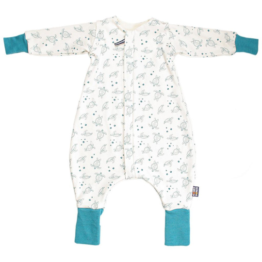 Nožičkový spací pytel s odepínacími rukávy, podšívka je z úpletu merino vlny. Vnější strana je ze 100% bio-bavlny s motivem želviček. Délka spacího pytle je 80 cm - to je délka miminka od ramen ke kotníkům. Zip umožní otevření spacího pytle po celé délce v obou směrech a má látkovou krytku, která zabraňuje přiskřípnutí krku do zipu. Rukávy se připínají pomocí druků. Ruční praní do 30 °C. Nepoužívat aviváž! Česká výroba.