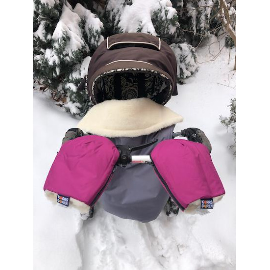 Jeden pár fialových rukavic na všechny typy rukojetí kočárků. Vnější vrstva rukavic je z nepromokavé plášťoviny, uvnitř je vrstva oteplovacího rouna a podšívka je z merino vlny. Na rukojeti v celku se rukavičky navléknou a zapnou se zipy, na oddělené rukojeti golfových kočárků se rukavičky nasadí připraveným otvorem a připevní se gumičkou. Merino vlna je přírodní chlupatý materiál, který má úžasné termoregulační vlastnosti a dokáže hřát i když je mokrý. Vlastností materiálu také je, že pouští chloupky (líná). Pokud začne línat více stačí rukávník otevřít a vniřní merino vysát vysavačem, línání poté ustane, nebo se výrazně sníží. Jelikož rukavice obsahují vlnu nedoporučuje se je prát v pračce, ale ručně ve studené vodě a v přípravcích na vlnu. Velikost je univerzální, vyrobeno v České republice.