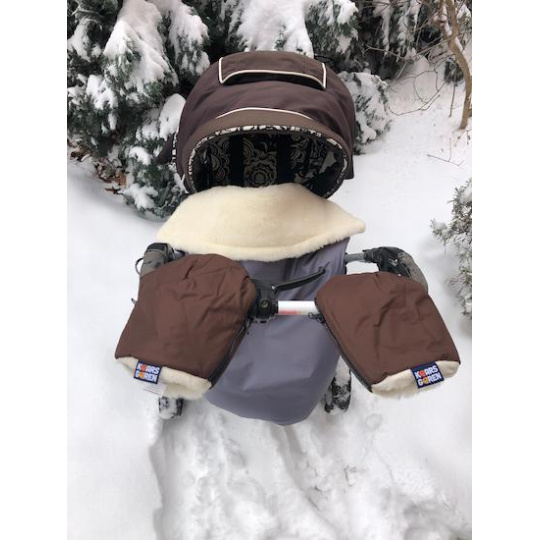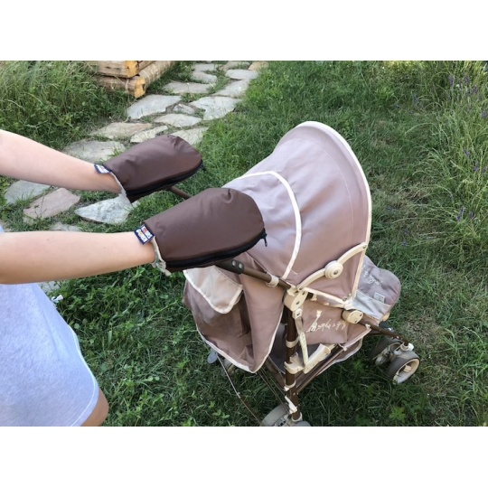 Jeden pár hnědých rukavic na všechny typy rukojetí kočárků. Vnější vrstva rukavic je z nepromokavé plášťoviny, uvnitř je vrstva oteplovacího rouna a podšívka je z merino vlny. Na rukojeti v celku se rukavičky navléknou a zapnou se zipy, na oddělené rukojeti golfových kočárků se rukavičky nasadí připraveným otvorem a připevní se gumičkou. Merino vlna je přírodní chlupatý materiál, který má úžasné termoregulační vlastnosti a dokáže hřát i když je mokrý. Vlastností materiálu také je, že pouští chloupky (líná). Pokud začne línat více stačí rukávník otevřít a vniřní merino vysát vysavačem, línání poté ustane, nebo se výrazně sníží. Jelikož rukavice obsahují vlnu nedoporučuje se je prát v pračce, ale ručně ve studené vodě a v přípravcích na vlnu. Velikost je univerzální, vyrobeno v České republice.