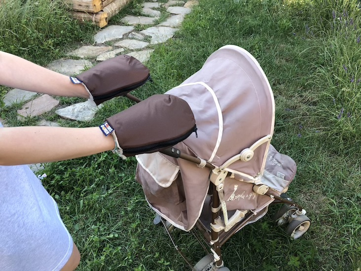 Jeden pár hnědých rukavic na všechny typy rukojetí kočárků. Vnější vrstva rukavic je z nepromokavé plášťoviny, uvnitř je vrstva oteplovacího rouna a podšívka je z merino vlny. Na rukojeti v celku se rukavičky navléknou a zapnou se zipy, na oddělené rukojeti golfových kočárků se rukavičky nasadí připraveným otvorem a připevní se gumičkou. Merino vlna je přírodní chlupatý materiál, který má úžasné termoregulační vlastnosti a dokáže hřát i když je mokrý. Vlastností materiálu také je, že pouští chloupky (líná). Pokud začne línat více stačí rukávník otevřít a vniřní merino vysát vysavačem, línání poté ustane, nebo se výrazně sníží. Jelikož rukavice obsahují vlnu nedoporučuje se je prát v pračce, ale ručně ve studené vodě a v přípravcích na vlnu. Velikost je univerzální, vyrobeno v České republice.