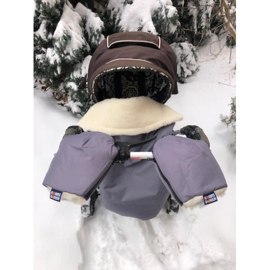Jeden pár šedých rukavic na všechny typy rukojetí kočárků. Vnější vrstva rukavic je z nepromokavé plášťoviny, uvnitř je vrstva oteplovacího rouna a podšívka je z merino vlny. Na rukojeti v celku se rukavičky navléknou a zapnou se zipy, na oddělené rukojeti golfových kočárků se rukavičky nasadí připraveným otvorem a připevní se gumičkou. Merino vlna je přírodní chlupatý materiál, který má úžasné termoregulační vlastnosti a dokáže hřát i když je mokrý. Vlastností materiálu také je, že pouští chloupky (líná). Pokud začne línat více stačí rukávník otevřít a vniřní merino vysát vysavačem, línání poté ustane, nebo se výrazně sníží. Jelikož rukavice obsahují vlnu nedoporučuje se je prát v pračce, ale ručně ve studené vodě a v přípravcích na vlnu. Velikost je univerzální, vyrobeno v České republice.