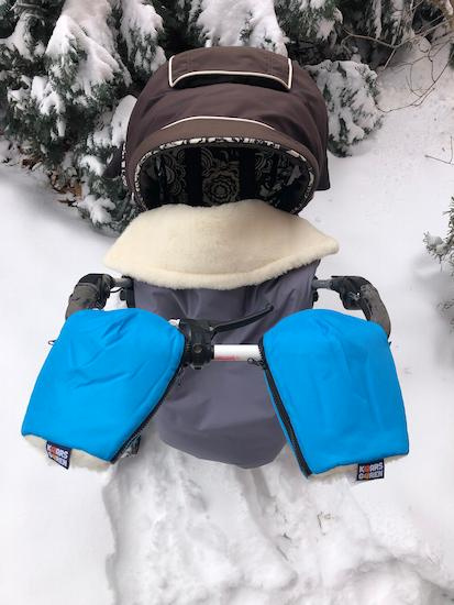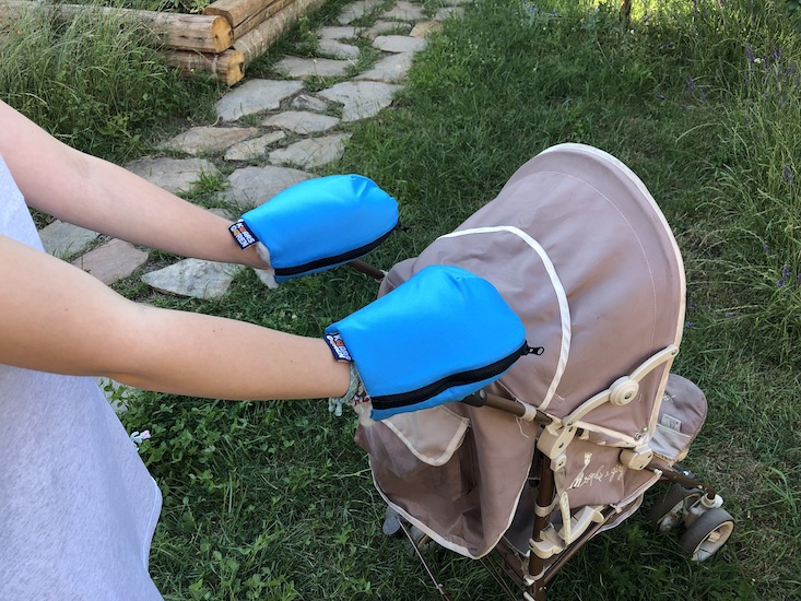 Jeden pár tyrkysových rukavic na všechny typy rukojetí kočárků. Vnější vrstva rukavic je z nepromokavé plášťoviny, uvnitř je vrstva oteplovacího rouna a podšívka je z merino vlny. Na rukojeti v celku se rukavičky navléknou a zapnou se zipy, na oddělené rukojeti golfových kočárků se rukavičky nasadí připraveným otvorem a připevní se gumičkou. Merino vlna je přírodní chlupatý materiál, který má úžasné termoregulační vlastnosti a dokáže hřát i když je mokrý. Vlastností materiálu také je, že pouští chloupky (líná). Pokud začne línat více stačí rukávník otevřít a vniřní merino vysát vysavačem, línání poté ustane, nebo se výrazně sníží. Jelikož rukavice obsahují vlnu nedoporučuje se je prát v pračce, ale ručně ve studené vodě a v přípravcích na vlnu. Velikost je univerzální, vyrobeno v České republice.