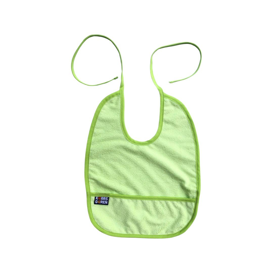Zelený nepropustný bryndáček. Povrch bryndáčku z obou stran je z bavlněného froté, uprostřed je nepropustný polyuretan. Bryndáček má kapsu na zachycení jídla a tekutin. Praní na 60 °C, vyrobeno v ČR.