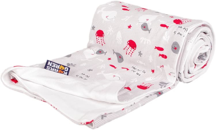 Oboustranná deka z bambusové viskózy a bavlny. Vrchní strana je z bavlny s motivem rybiček a podšívka je z bambusové viskózy. Velikost deky je 100 x 150 cm. Praní na 40° C. Česká výroba.