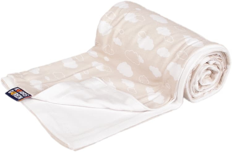 Oboustranná deka z bambusové viskózy a bavlny. Vrchní strana je z bavlny s motivem obláčků a podšívka je z bambusové viskózy. Velikost deky je 70 x 100 cm. Praní na 40° C. Česká výroba.