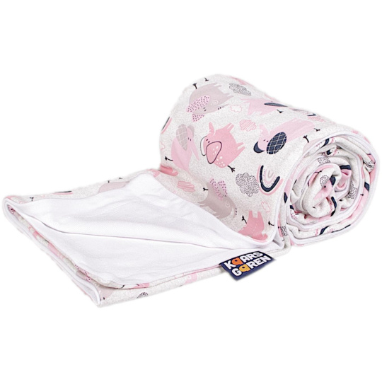 Oboustranná deka z bambusové viskózy a bavlny. Vrchní strana je z bavlny s motivem růžových slonů a podšívka je z bambusové viskózy. Velikost deky je 70 x 100 cm. Praní na 40 °C. Česká výroba.