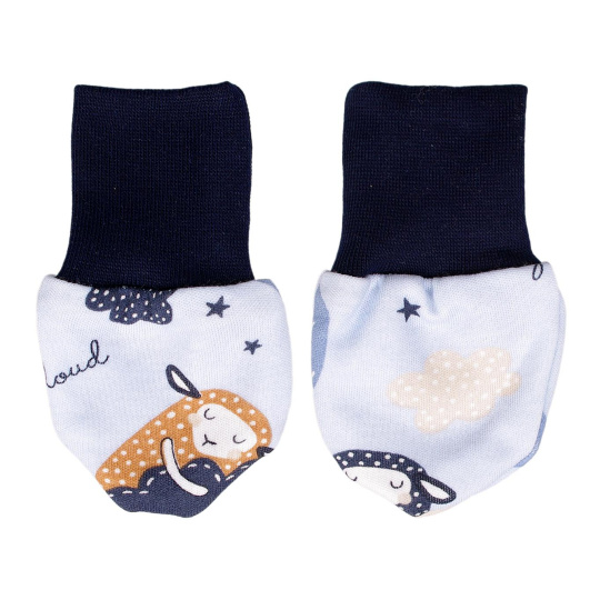 Bezpalcové rukavičky pro novorozené miminko. Rukavičky jsou modré s motivem oveček. Rukavičky jsou vyrobené ze 100% bavlny, pružný náplet je 95% bavlna a 5% lycra. Rukavice ochrání miminko před poškrábáním obličeje a udržují ručičky v teple. Lze prát v pračce na 40 °C. Česká výroba.