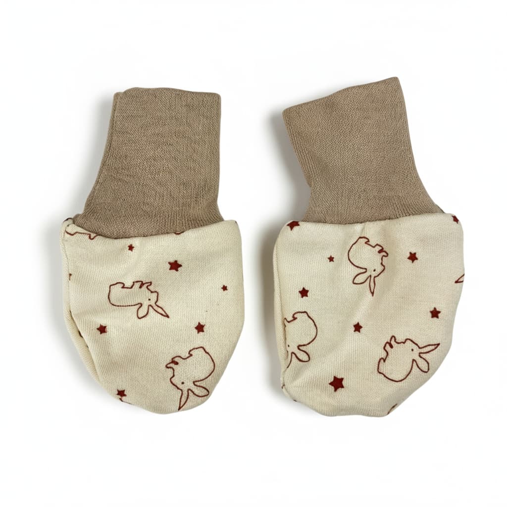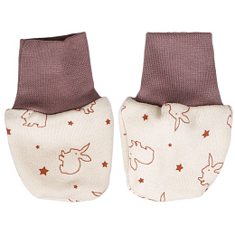 Bezpalcové rukavičky pro novorozené miminko. Rukavičky jsou vyrobené ze 100% bio-bavlny s motivem králíčků, pružný náplet je 95% bio-bavlna a 5% lycra. Rukavice ochrání miminko před poškrábáním obličeje a udržují ručičky v teple. Lze prát v pračce na 40 °C. Česká výroba.