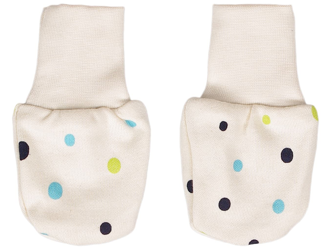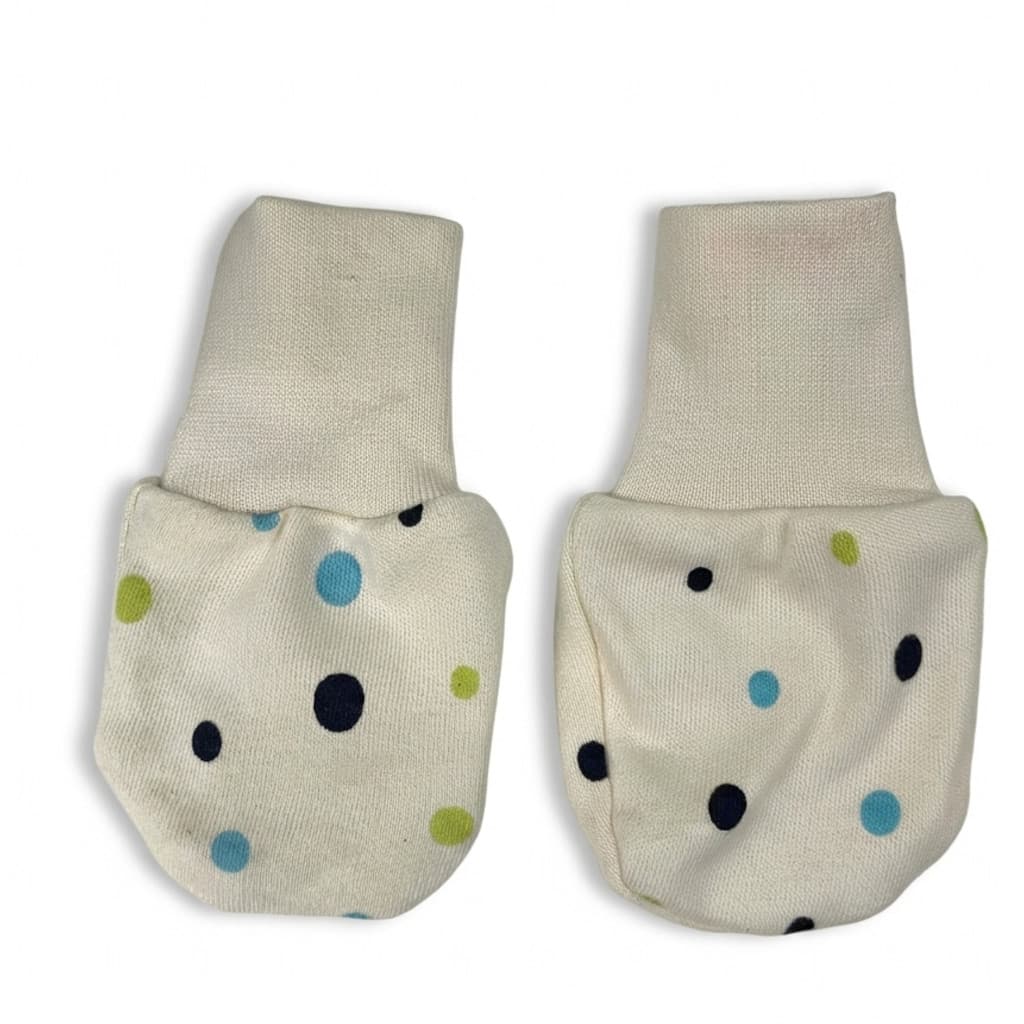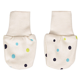 Bezpalcové rukavičky pro novorozené miminko. Rukavičky jsou vyrobené ze 100% bio-bavlny s motivem puntíčků, pružný náplet je 95% bio-bavlna a 5% lycra. Rukavice ochrání miminko před poškrábáním obličeje a udržují ručičky v teple. Lze prát v pračce na 40 °C. Česká výroba.