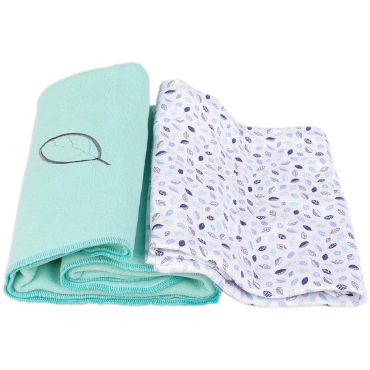 Sada dětských dek s motivem lístečků. Jedna deka je z mentolového flísu s výšivkou listu (70 x 100 cm) a druhá je z bavlny s motivem lístečků (70 x 100 cm). Praní na 30 °C. Česká výroba.