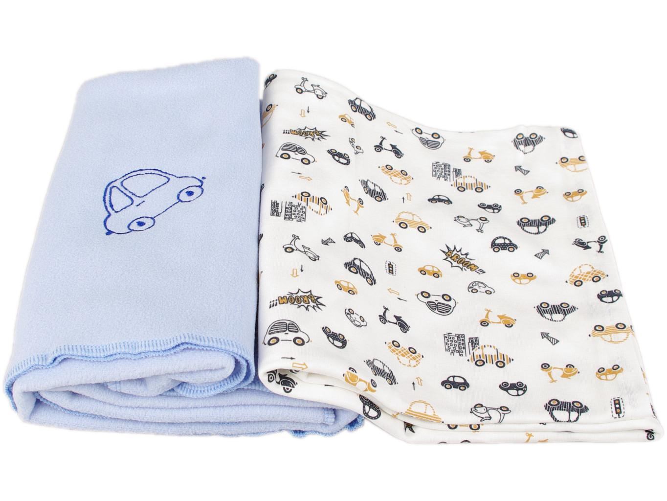 Sada dětských dek s motivem autíček. Jedna deka je z modrého flísu s výšivkou auta (70 x 100 cm) a druhá je z bavlny s motivem autíček (70 x 100 cm). Praní na 30 °C. Česká výroba.
