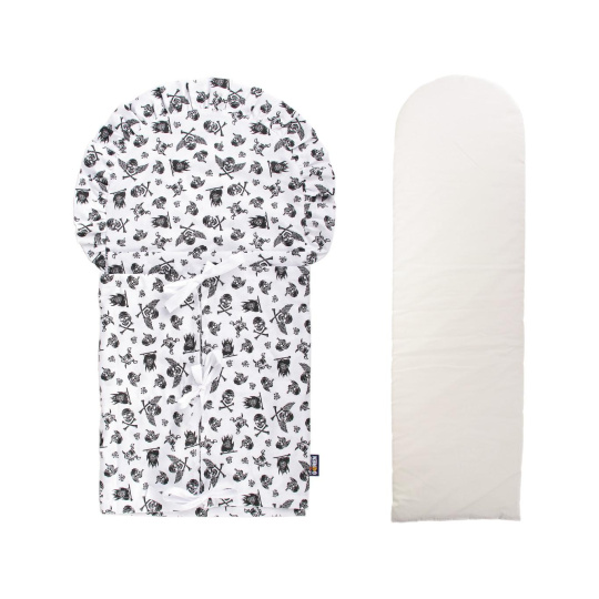 Sada potah klasické zavinovačky s trojitým vázáním v bílé barvě s motivem pirátských lebek a výplň do zavinovačky. Povlak zavinovačky je ze 100% bavlny a lze ho prát v pračce na 40° C, velikost povlaku a tedy i zavinovačky je cca 115 x 33 cm. Složení materiálu vložky (výplně) zavinovačky: povrch 100% bavlna, výplň 100% polyester. Výplň lze prát v pračce na 30° C, má rozměr cca 110 x 33 cm. Zavinovačka je vhodná jako výbava do porodnice, protože novorozená miminka jsou zvyklá na těsný prostor maminčina bříška a po zavinutí se cítí bezpečně a rychle se zklidní.