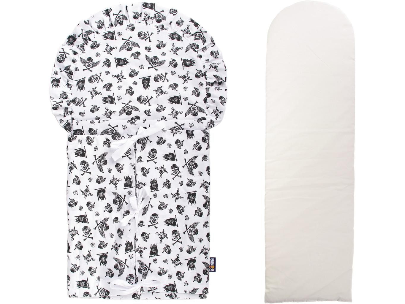 Sada potah klasické zavinovačky s trojitým vázáním v bílé barvě s motivem pirátských lebek a výplň do zavinovačky. Povlak zavinovačky je ze 100% bavlny a lze ho prát v pračce na 40° C, velikost povlaku a tedy i zavinovačky je cca 115 x 33 cm. Složení materiálu vložky (výplně) zavinovačky: povrch 100% bavlna, výplň 100% polyester. Výplň lze prát v pračce na 30° C, má rozměr cca 110 x 33 cm. Zavinovačka je vhodná jako výbava do porodnice, protože novorozená miminka jsou zvyklá na těsný prostor maminčina bříška a po zavinutí se cítí bezpečně a rychle se zklidní.