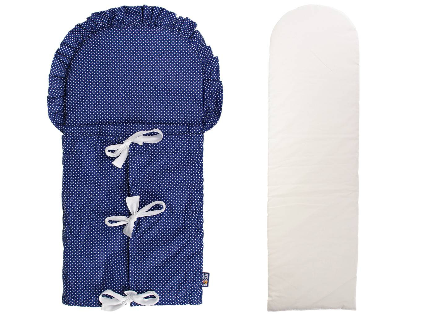 Sada potah klasické zavinovačky s trojitým vázáním v tmavomodré barvě s motivem puntíků a výplň do zavinovačky. Povlak zavinovačky je ze 100% bavlny a lze ho prát v pračce na 40° C, velikost povlaku a tedy i zavinovačky je cca 115 x 33 cm. Složení materiálu vložky (výplně) zavinovačky: povrch 100% bavlna, výplň 100% polyester. Výplň lze prát v pračce na 30° C, má rozměr cca 110 x 33 cm. Zavinovačka je vhodná jako výbava do porodnice, protože novorozená miminka jsou zvyklá na těsný prostor maminčina bříška a po zavinutí se cítí bezpečně a rychle se zklidní.