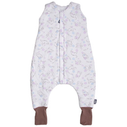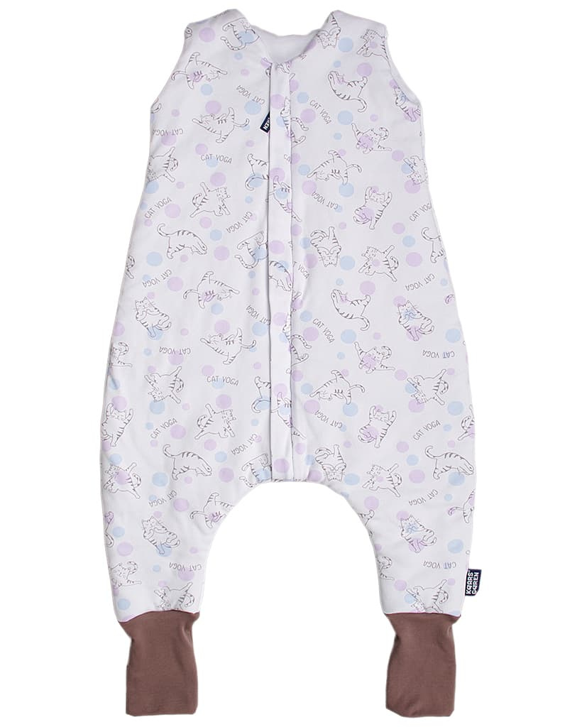 Dětský spací pytel ve smetanovém odstínu s veselým potiskem koček cvičících jógu. Díky nohavicím se dítě může pohodlně pohybovat a překlápěcí náplety zajistí teplé nožičky.