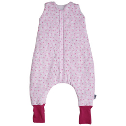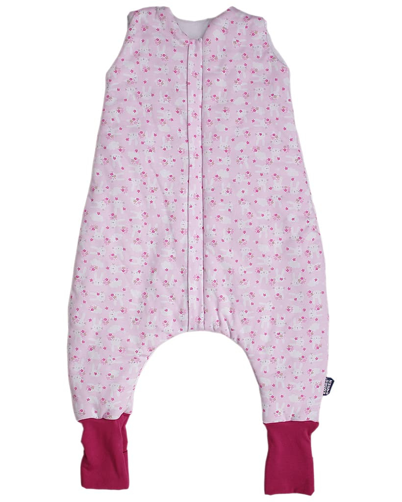 Dětský spací pytel v jemně růžové barvě s motivem zajíčků. Díky nohavicím se dítě může pohodlně pohybovat a náplety na nohavicích udrží nožičky v teple.