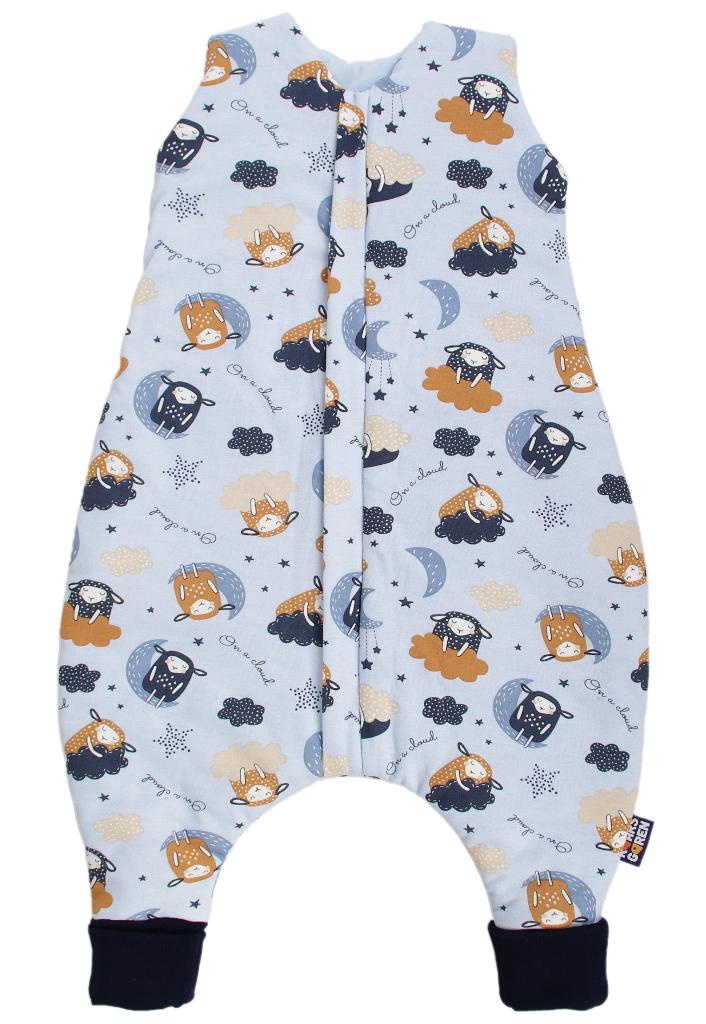 Dětský spací pytel s nohavicemi. Spací pytel je modrý s motivem oveček. Délka spacího pytle je cca 100 cm, lze jej prát v pračce při 30 °C. Spací pytel má uprostřed zip a lze jej zcela otevřít, navíc má zip látkovou krytku, která zabraňuje přiskřípnutí krku do zipu. Spací pytel je ušitý ze tří vrstev: vrchní materiál 100% bavlna, výplň 100% polyester, podšívka 100% bavlna. Česká výroba.