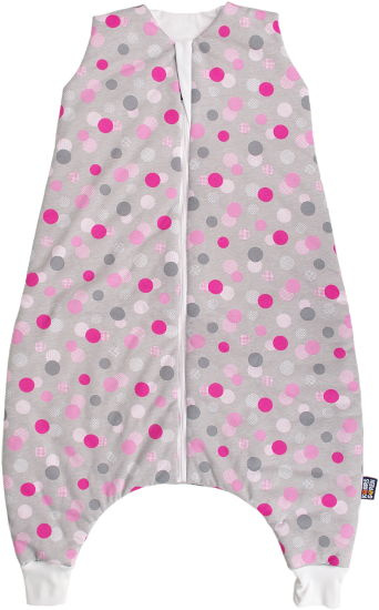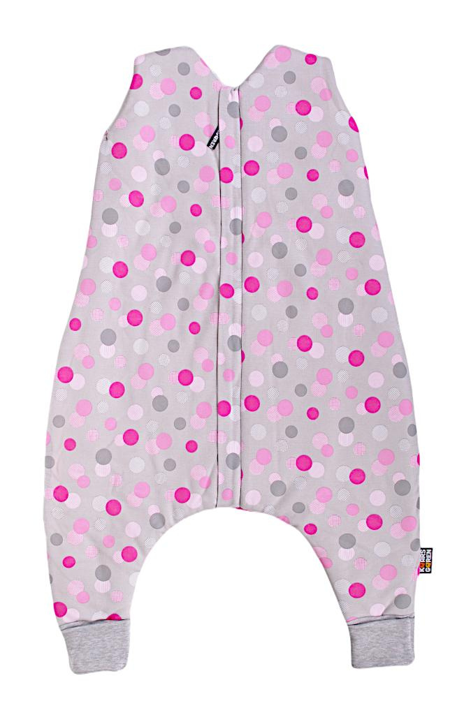 Dětský spací pytel s otvory pro nohy v šedé barvě a s motivem barevných puntíků. Délka spacího pytle je cca 100 cm, lze jej prát v pračce při 30 °C. Spací pytel má uprostřed zip a lze jej zcela otevřít, navíc má zip látkovou krytku, která zabraňuje přiskřípnutí krku do zipu. Spací pytel je ušitý ze tří vrstev: vrchní materiál 100% bavlna, výplň 100% polyester, podšívka 100% bavlna. Česká výroba.