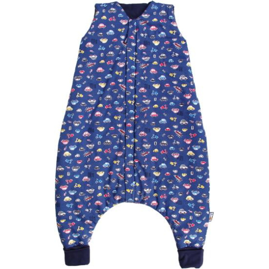 Dětský spací pytel s otvory pro nohy v tmavomodré barvě a s motivem autíček, dítě v něm může volně kopat nožičkami. Délka spacího pytle je cca 100 cm, to je výška dítěte k ramenům. Lze jej prát v pračce při 30 °C. Spací pytel má uprostřed zip a lze jej zcela otevřít v obou směrech, navíc má zip látkovou krytku, která zabraňuje přiskřípnutí krku do zipu. Náplety na nožičkách lze překlopit a otvory uzavřít, takže nožičky zůstanou v teple. Spací pytel je ušitý ze tří vrstev: vrchní materiál 100% bavlna, výplň 100% polyester, podšívka 100% bavlna. Česká výroba.