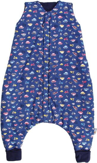 Dětský spací pytel s otvory pro nohy v tmavomodré barvě a s motivem autíček, dítě v něm může volně kopat nožičkami. Délka spacího pytle je cca 100 cm, to je výška dítěte k ramenům. Lze jej prát v pračce při 30 °C. Spací pytel má uprostřed zip a lze jej zcela otevřít v obou směrech, navíc má zip látkovou krytku, která zabraňuje přiskřípnutí krku do zipu. Náplety na nožičkách lze překlopit a otvory uzavřít, takže nožičky zůstanou v teple. Spací pytel je ušitý ze tří vrstev: vrchní materiál 100% bavlna, výplň 100% polyester, podšívka 100% bavlna. Česká výroba.