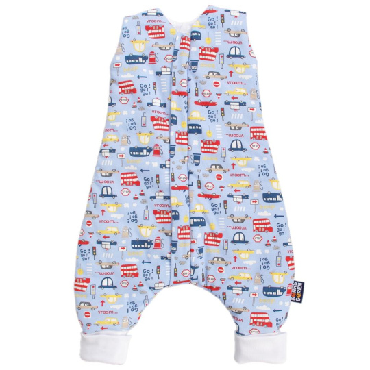 Dětský spací pytel s otvory pro nohy v modré barvě a s motivem autíček, miminko v něm může volně kopat nožičkami. Délka spacího pytle je cca 60 cm, to je výška dítěte k ramenům. Lze jej prát v pračce při 30 °C. Spací pytel má uprostřed zip a lze jej zcela otevřít v obou směrech, navíc má zip látkovou krytku, která zabraňuje přiskřípnutí krku do zipu. Náplety na nožičkách lze překlopit a otvory uzavřít, takže nožičky zůstanou v teple. Spací pytel je ušitý ze tří vrstev: vrchní materiál 100% bavlna, výplň 100% polyester, podšívka 100% bavlna. Česká výroba.