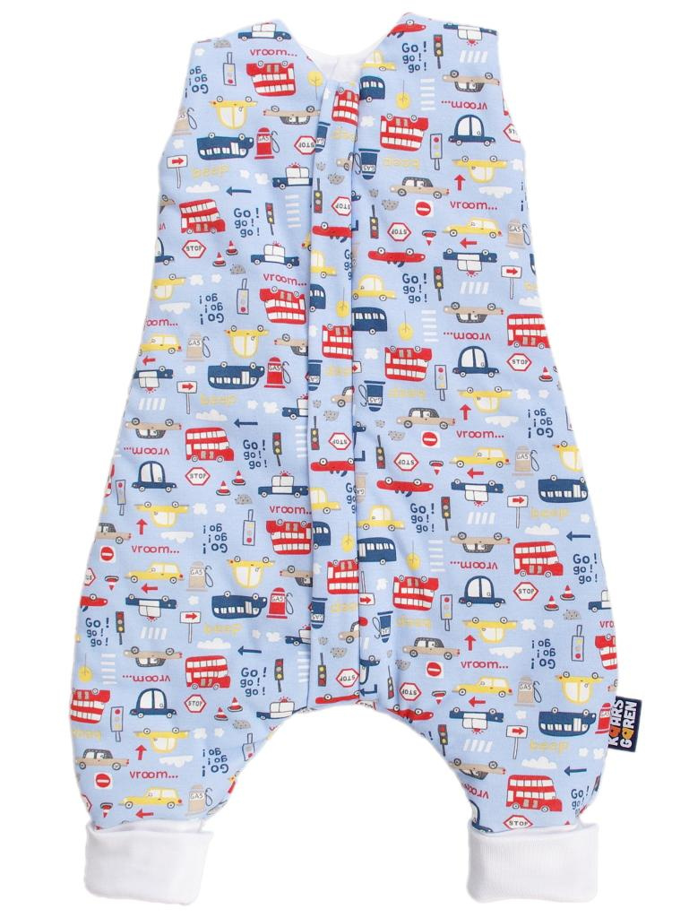 Dětský spací pytel s otvory pro nohy v modré barvě a s motivem autíček, miminko v něm může volně kopat nožičkami. Délka spacího pytle je cca 60 cm, to je výška dítěte k ramenům. Lze jej prát v pračce při 30 °C. Spací pytel má uprostřed zip a lze jej zcela otevřít v obou směrech, navíc má zip látkovou krytku, která zabraňuje přiskřípnutí krku do zipu. Náplety na nožičkách lze překlopit a otvory uzavřít, takže nožičky zůstanou v teple. Spací pytel je ušitý ze tří vrstev: vrchní materiál 100% bavlna, výplň 100% polyester, podšívka 100% bavlna. Česká výroba.