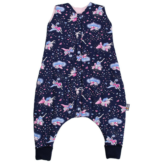Spací pytel s nohavicemi pro novorozené miminko. Spací pytel je modrý s motivem víl. Délka spacího pytle je cca 60 cm, lze jej prát v pračce při 30 °C. Spací pytel má uprostřed zip a lze jej zcela otevřít, navíc má zip látkovou krytku, která zabraňuje přiskřípnutí krku do zipu. Spací pytel je ušitý ze tří vrstev: vrchní materiál 100% bavlna, výplň 100% polyester, podšívka 100% bavlna. Česká výroba.