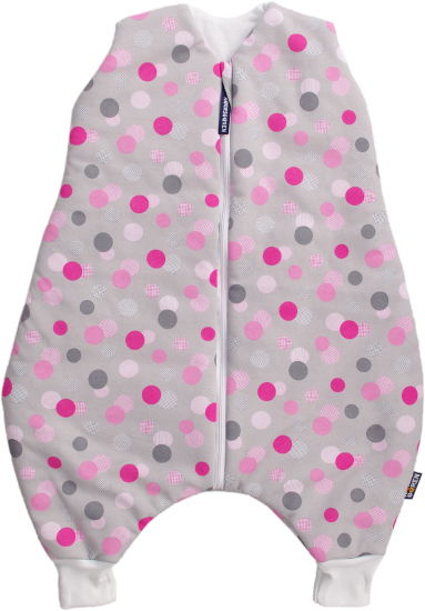 Spací pytel pro miminko s otvory pro nohy v šedé barvě a s motivem puntíků. Délka spacího pytle je cca 70 cm, lze jej prát v pračce při 30 °C. Spací pytel má uprostřed zip a lze jej zcela otevřít, navíc má zip látkovou krytku, která zabraňuje přiskřípnutí krku do zipu. Spací pytel je ušitý ze tří vrstev: vrchní materiál 100% bavlna, výplň 100% polyester, podšívka 100% bavlna. Česká výroba.