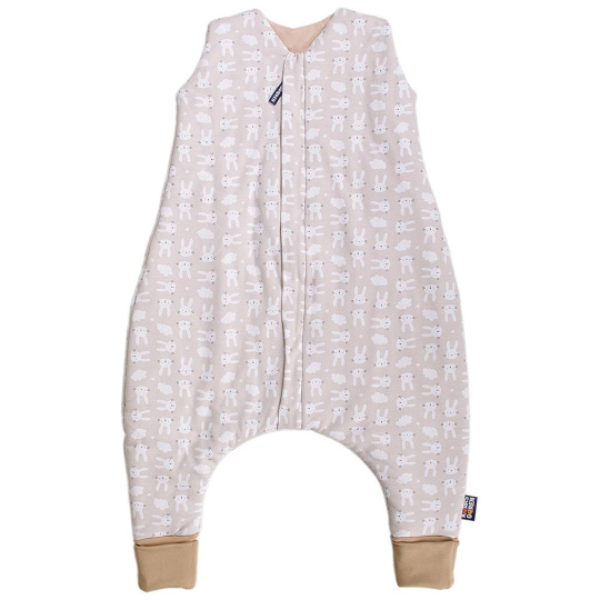 Dětský spací pytel s nohavicemi v béžové barvě a s motivem zajíčků, dítě se v něm nepřetáčí. Délka spacího pytle je cca 90 cm, to je výška dítěte k ramenům. Lze jej prát v pračce při 30 °C. Spací pytel má uprostřed zip a lze jej zcela otevřít v obou směrech, navíc má zip látkovou krytku, která zabraňuje přiskřípnutí krku do zipu. Náplety na nožičkách lze překlopit a použít jako ponožky, takže nožičky zůstanou v teple. Spací pytel je ušitý ze tří vrstev: vrchní materiál 100% bavlna, výplň 100% polyester, podšívka 100% bavlna. Česká výroba. Tog 2,61.