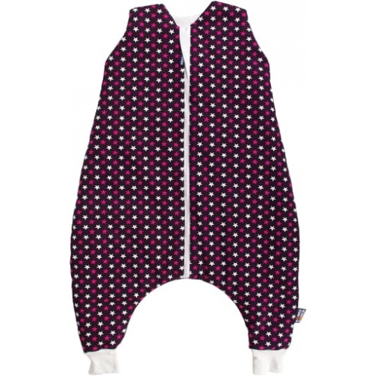 Dětský spací pytel s otvory pro nohy ve fialové barvě a s motivem hvězdiček, miminko v něm může volně kopat nožičkami. Délka spacího pytle je cca 90 cm, to je výška dítěte k ramenům. Lze jej prát v pračce při 30 °C. Spací pytel má uprostřed zip a lze jej zcela otevřít, navíc má zip látkovou krytku, která zabraňuje přiskřípnutí krku do zipu. Spací pytel je ušitý ze tří vrstev: vrchní materiál 100% bavlna, výplň 100% polyester, podšívka 100% bavlna. Česká výroba.