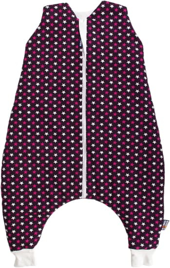 Dětský spací pytel s otvory pro nohy ve fialové barvě a s motivem hvězdiček, miminko v něm může volně kopat nožičkami. Délka spacího pytle je cca 90 cm, to je výška dítěte k ramenům. Lze jej prát v pračce při 30 °C. Spací pytel má uprostřed zip a lze jej zcela otevřít, navíc má zip látkovou krytku, která zabraňuje přiskřípnutí krku do zipu. Spací pytel je ušitý ze tří vrstev: vrchní materiál 100% bavlna, výplň 100% polyester, podšívka 100% bavlna. Česká výroba.