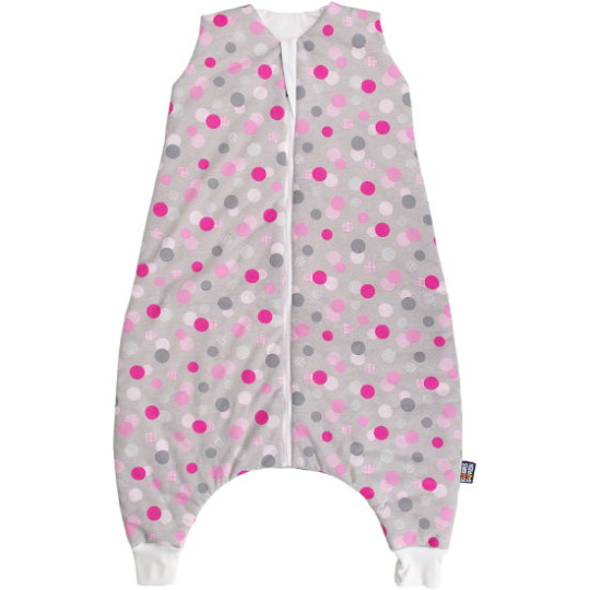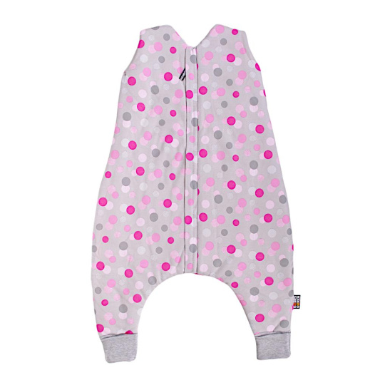 Dětský spací pytel s otvory pro nohy v šedé barvě a s motivem barevných puntíků. Délka spacího pytle je cca 90 cm, lze jej prát v pračce při 30 °C. Spací pytel má uprostřed zip a lze jej zcela otevřít, navíc má zip látkovou krytku, která zabraňuje přiskřípnutí krku do zipu. Spací pytel je ušitý ze tří vrstev: vrchní materiál 100% bavlna, výplň 100% polyester, podšívka 100% bavlna. Česká výroba.