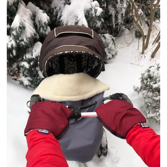 Jeden pár vínových rukavic na všechny typy rukojetí kočárků. Vnější vrstva rukavic je z nepromokavé plášťoviny, uvnitř je vrstva oteplovacího rouna a podšívka je z biobavlny. Biobavlna je vyrobená z GOTS certifikovanej priadze. Na rukojeti v celku se rukavičky navléknou a zapnou se zipy, na oddělené rukojeti golfových kočárků se rukavičky nasadí připraveným otvorem a připevní se gumičkou. Velikost je univerzální, praní na 30 °C, vyrobeno v České republice.
