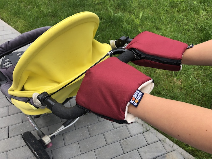 Jeden pár vínových rukavic na všechny typy rukojetí kočárků. Vnější vrstva rukavic je z nepromokavé plášťoviny, uvnitř je vrstva oteplovacího rouna a podšívka je z biobavlny. Biobavlna je vyrobená z GOTS certifikovanej priadze. Na rukojeti v celku se rukavičky navléknou a zapnou se zipy, na oddělené rukojeti golfových kočárků se rukavičky nasadí připraveným otvorem a připevní se gumičkou. Velikost je univerzální, praní na 30 °C, vyrobeno v České republice.